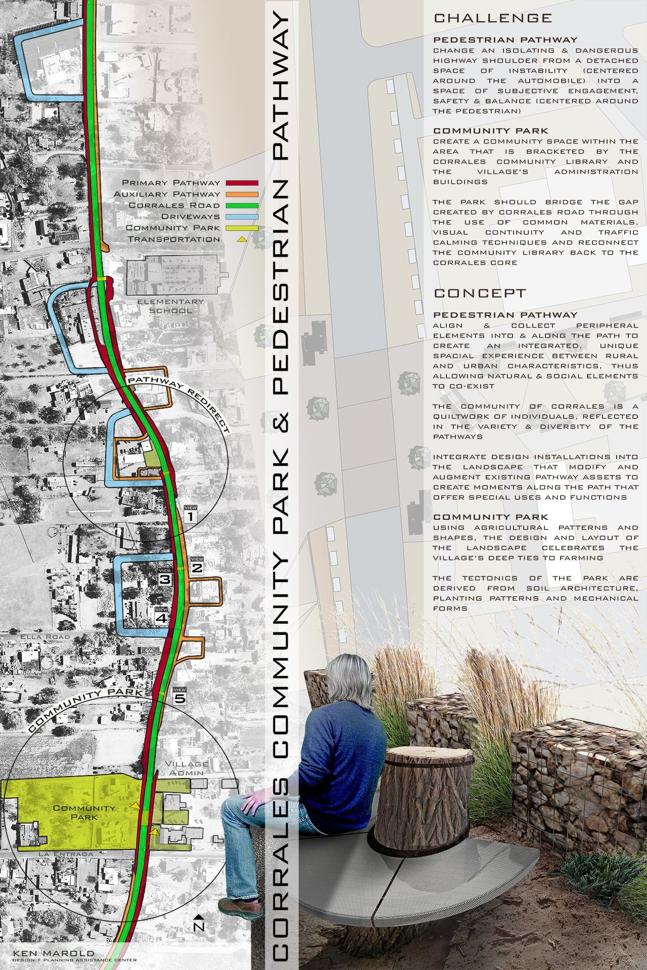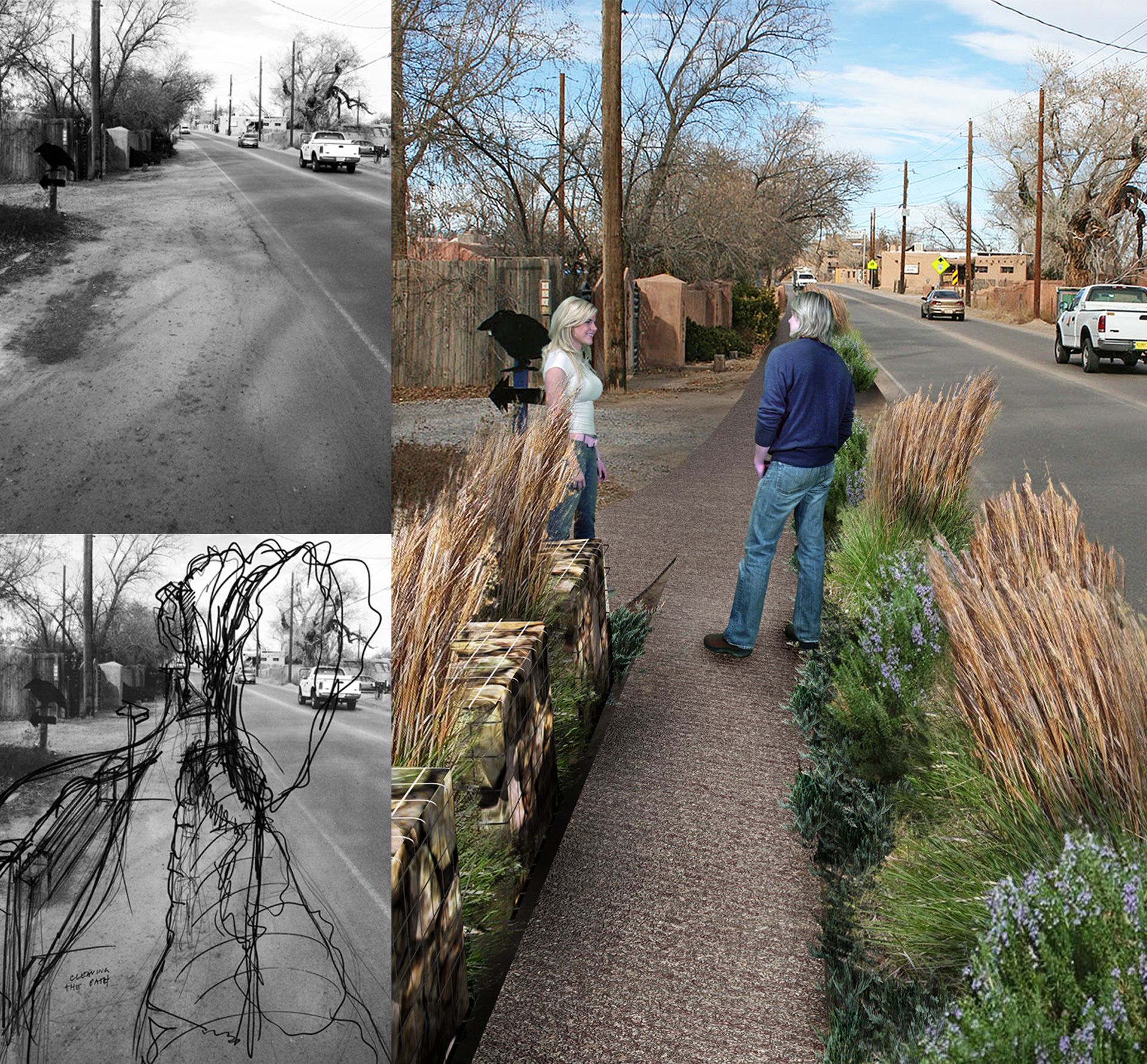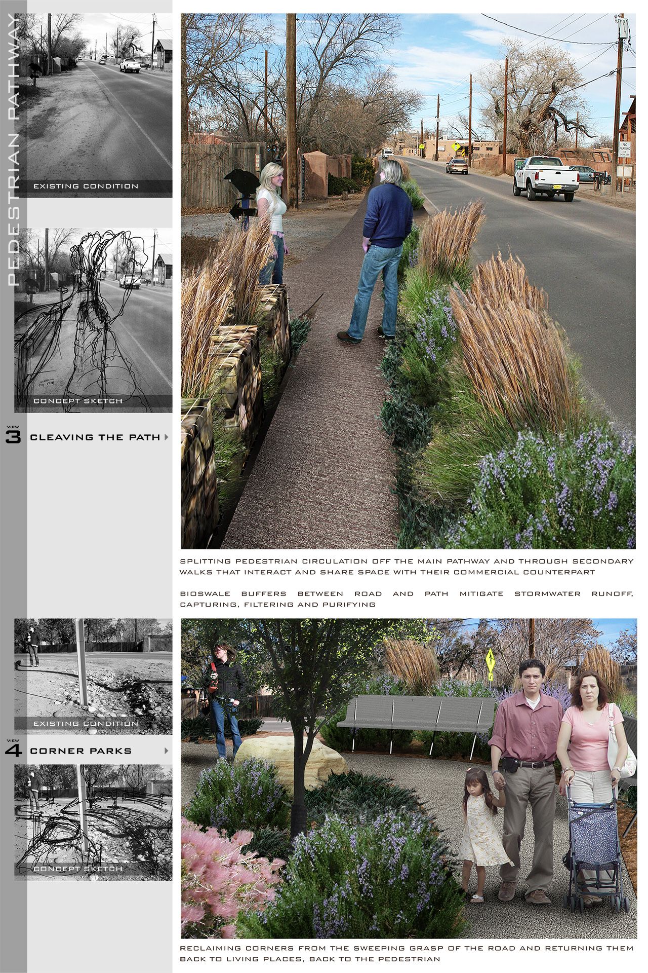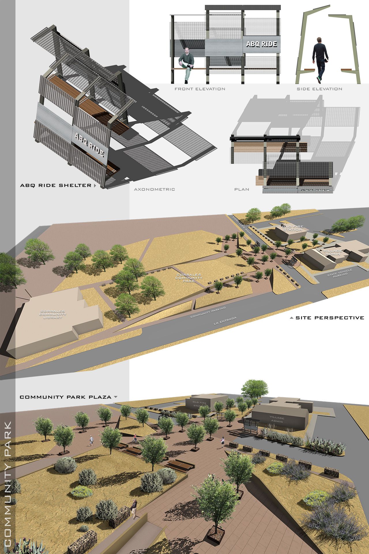 Set within the rural town of Corrales, New Mexico, this project reimagines a neglected highway shoulder as a civic landscape, transforming a space once defined by automobile dominance into one centered on pedestrian experience, cultural continuity, and environmental integration. The proposal includes a new community park and an enhanced pedestrian pathway, each contributing to a broader vision for safe, inclusive, and contextually rooted public infrastructure.