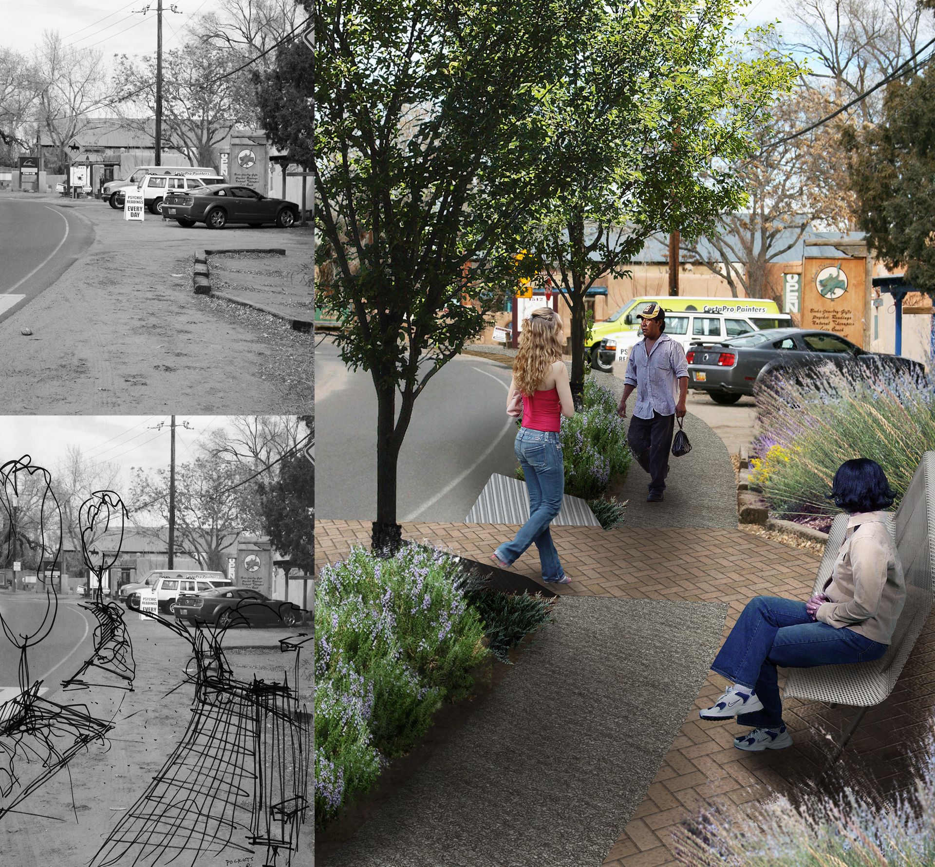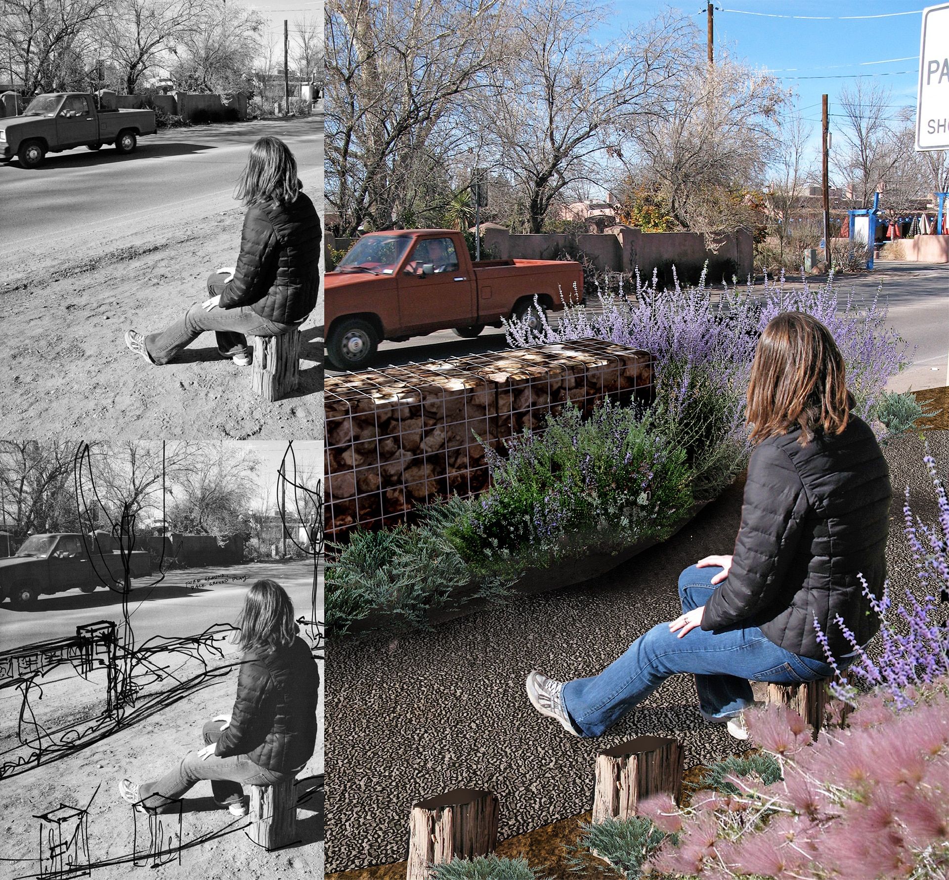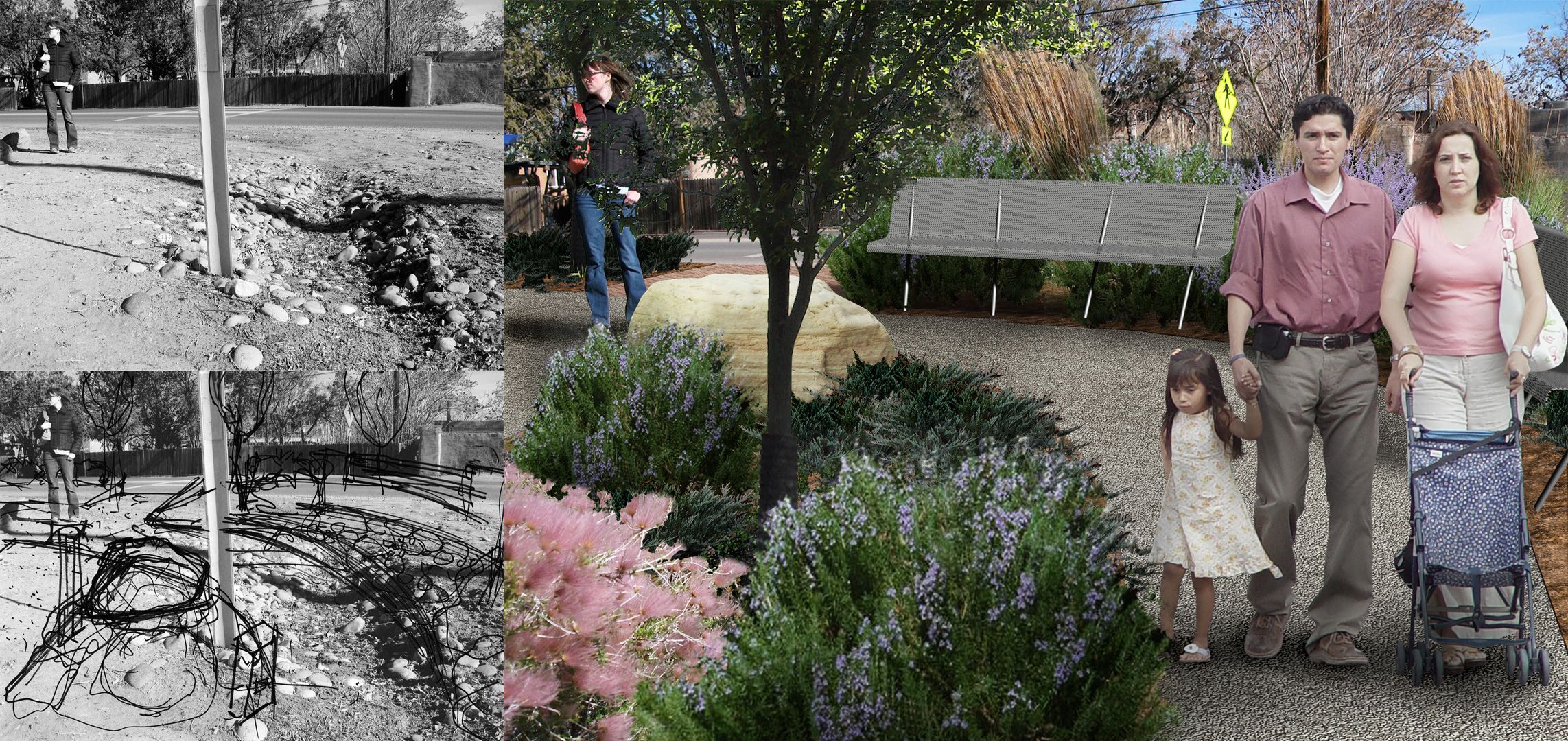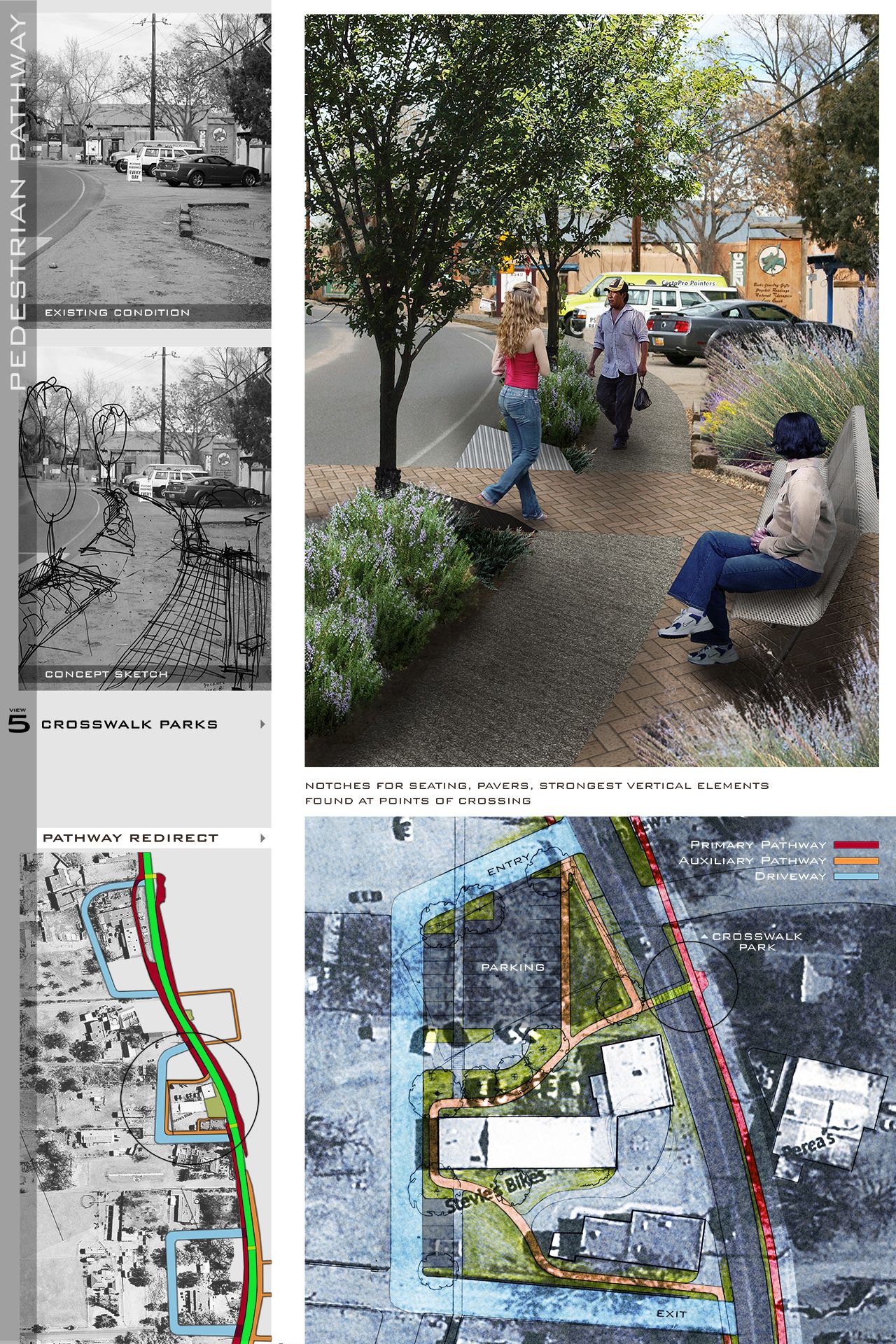 Set within the rural town of Corrales, New Mexico, this project reimagines a neglected highway shoulder as a civic landscape, transforming a space once defined by automobile dominance into one centered on pedestrian experience, cultural continuity, and environmental integration. The proposal includes a new community park and an enhanced pedestrian pathway, each contributing to a broader vision for safe, inclusive, and contextually rooted public infrastructure.