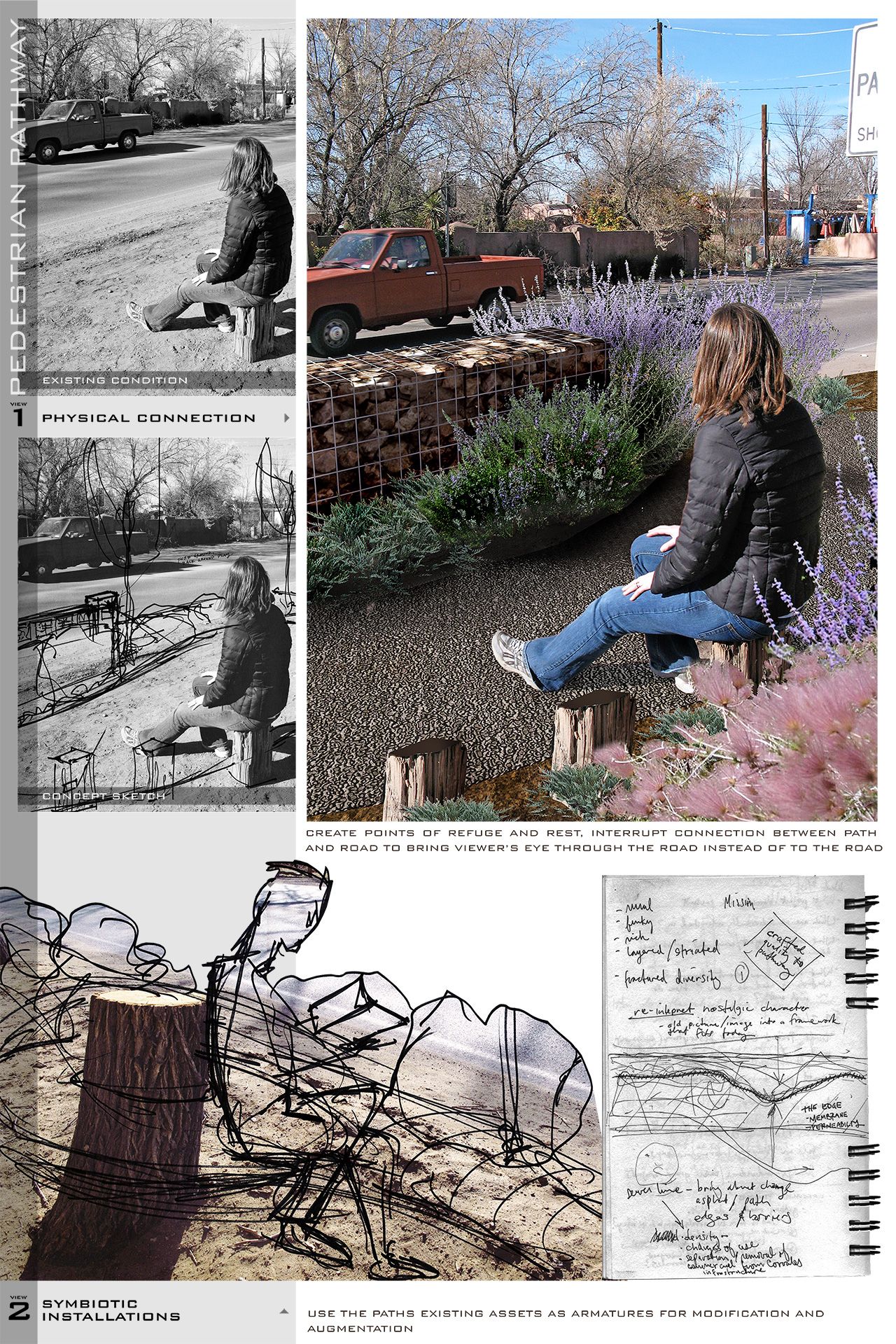 Landscape strategies merge ecological restoration with pedestrian experience, native shrubs and grasses define spatial boundaries while softening transitions between road edge and walking path. The use of gabions not only anchors seating and shade structures but subtly evokes erosion-control strategies used in nearby arroyos.