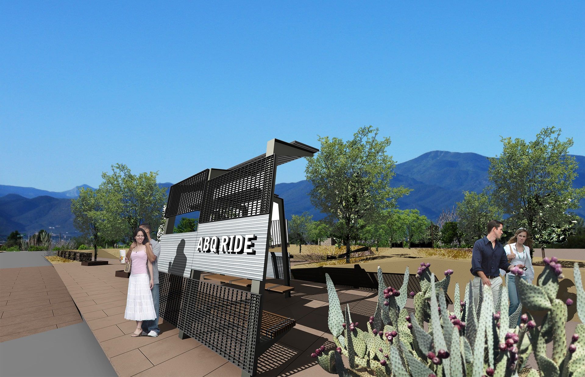 The design language is grounded in restraint and regional specificity. Hardscape materials include stabilized decomposed granite and textured concrete, offering durability while recalling the material palette of agricultural working ground. Custom seating, ABQ Ride transit shelters, and pathway installations adopt modular geometries that reflect mechanical forms seen in irrigation and farming equipment.