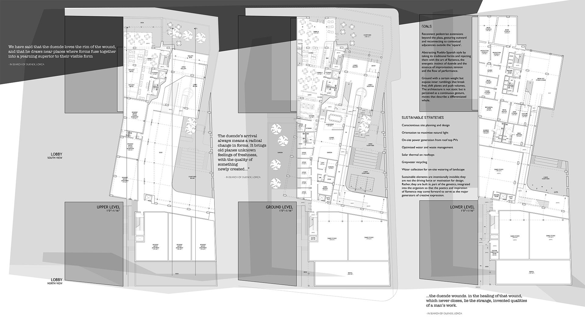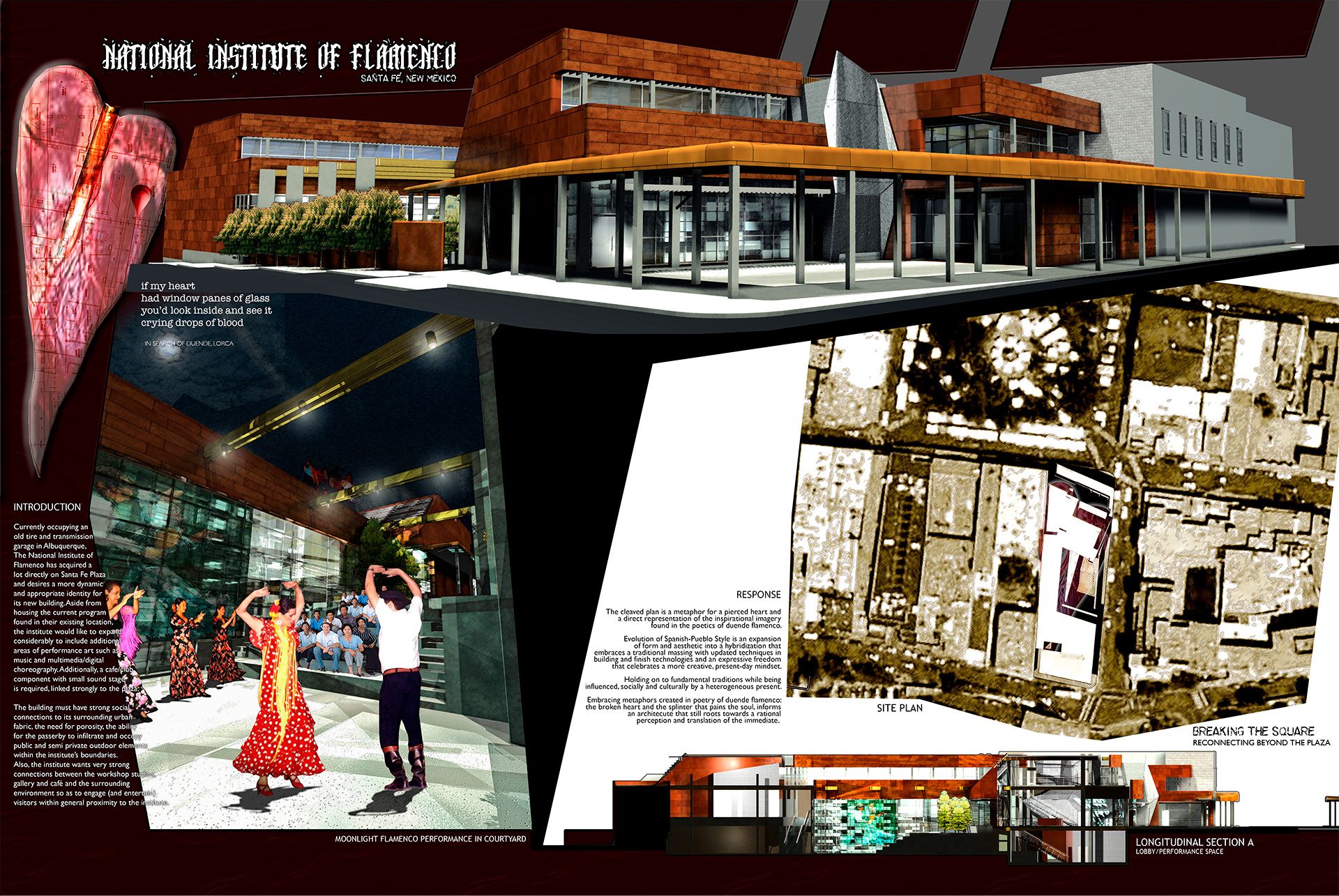 Integral to the architectural concept is the theme of “duende flamenco,” the deeply emotive and expressive spirit found in flamenco’s poetry and performance. The building’s cleaved plan symbolizes a pierced heart, a vivid metaphor for the emotional intensity of flamenco. This design not only embodies the art form’s passionate roots but also maintains strong connections to the surrounding urban fabric.