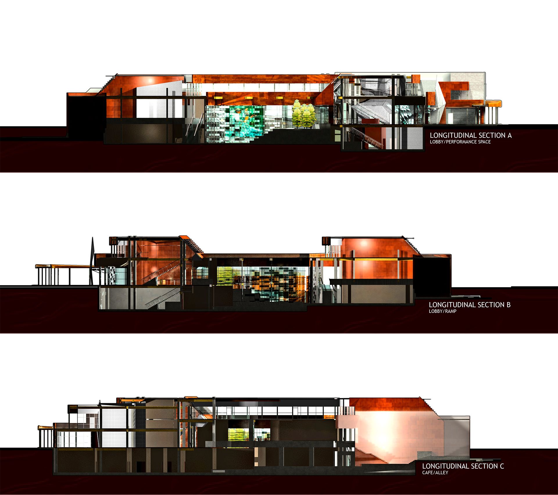 Responding to these needs, the institute’s new design dramatically expands its facilities to encompass additional performance areas, music spaces, and multimedia/digital choreography studios. Central to the institute’s mission is a cafe and club space with a small sound stage that extends a welcoming gesture towards the bustling public plaza.