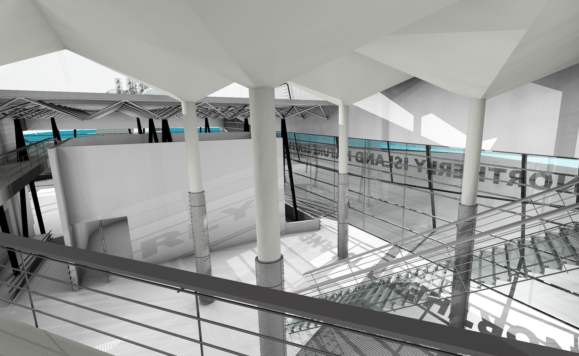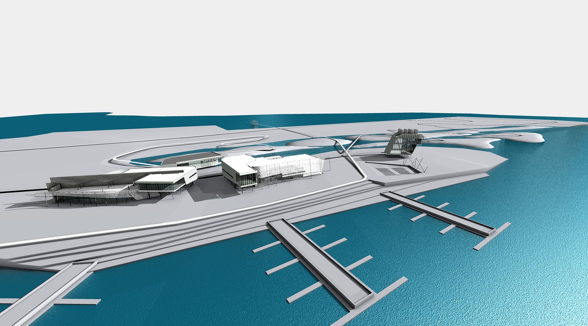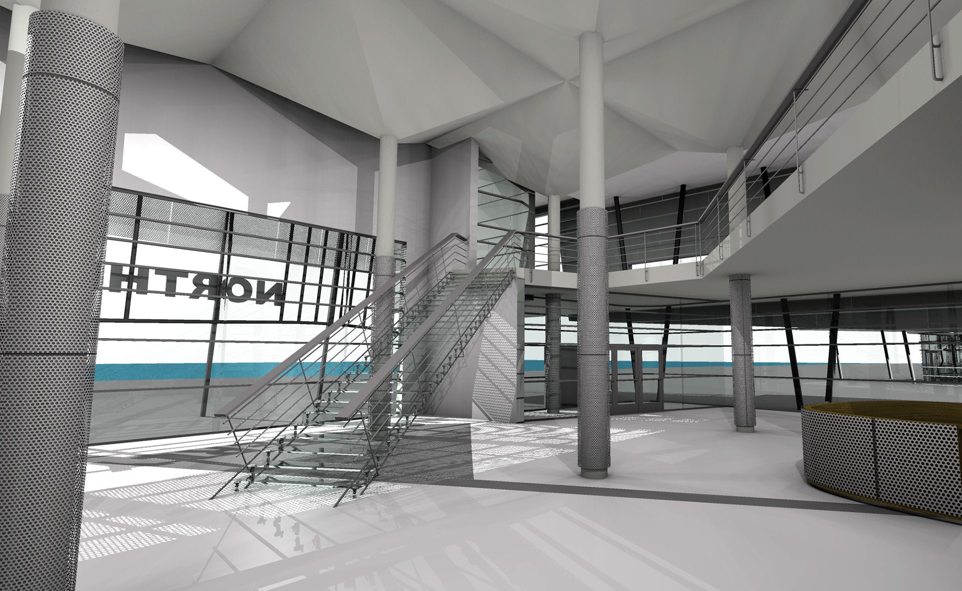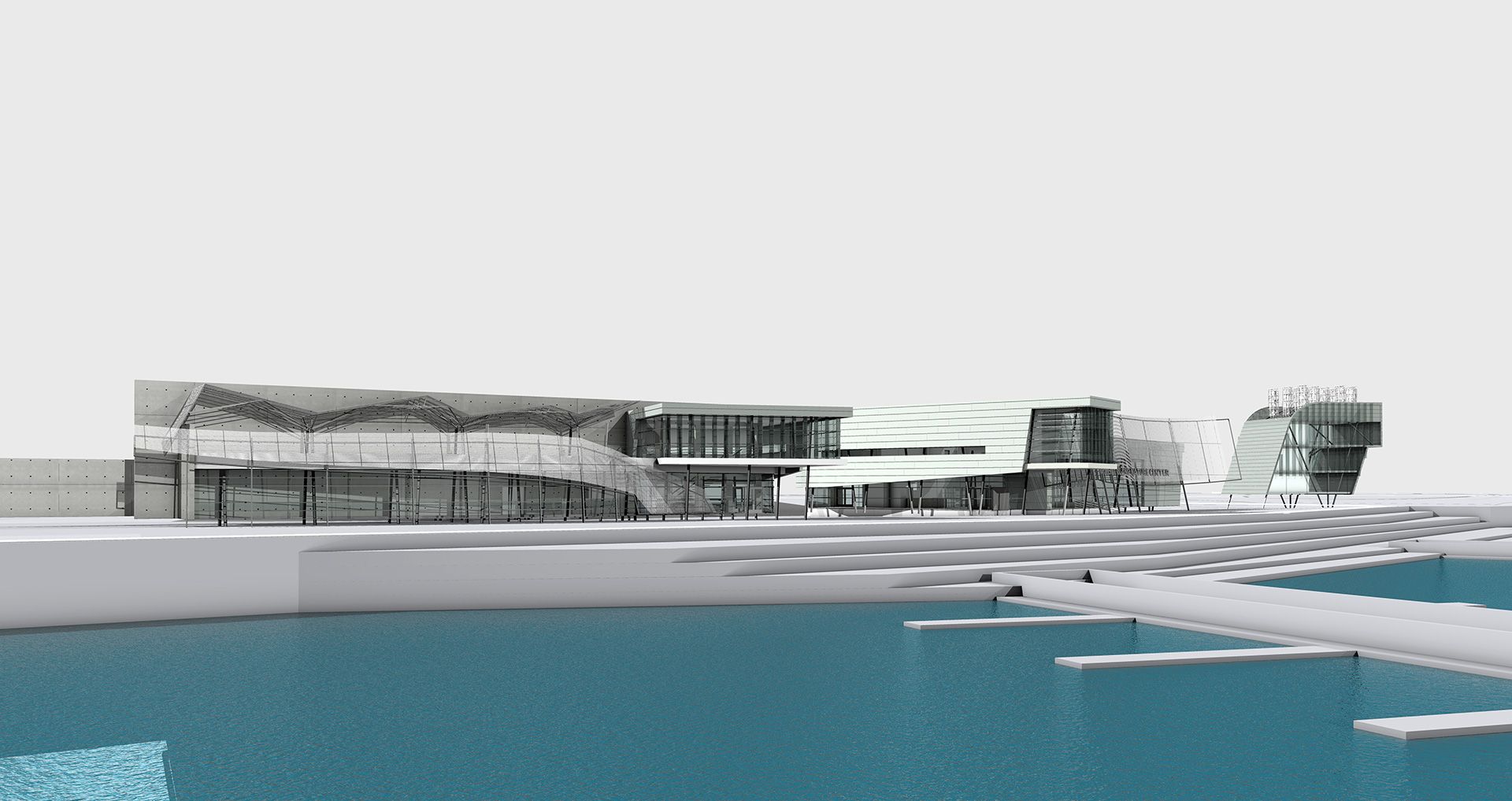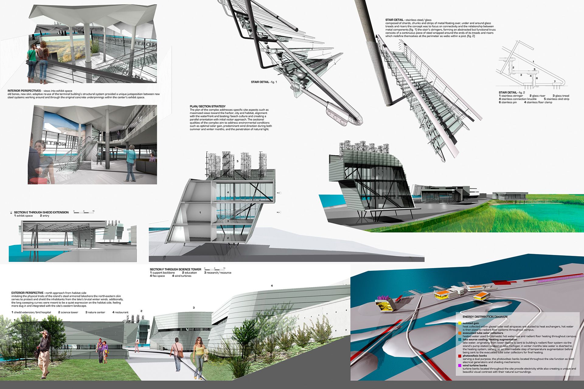 The architectural expression embraces an exposed structural logic, revealing trusses, glazing systems, and mechanical systems in dialogue with the site’s infrastructural character. Curtainwall assemblies, layered with photovoltaic and shading devices, frame long views across the lake while generating electricity and controlling heat gain. The science tower integrates educational programming with technical performance: housing wind turbines, resource monitoring systems, and vertical solar arrays in a highly visible vertical element.