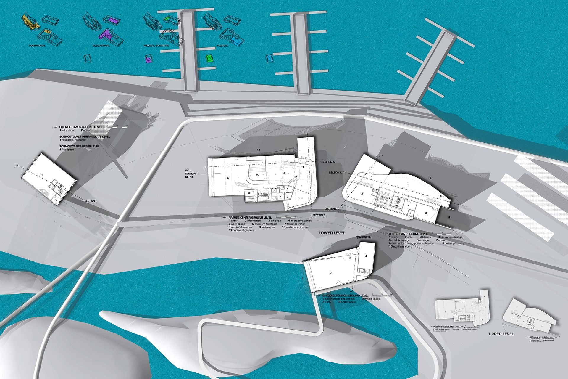 Publicness is a core design driver. The connective landscape is programmed with boat slips, kayak landings, outdoor classrooms, botanical installations, and performance zones. These areas are conceived as shared resources rather than extensions of any single building, enabling unprogrammed and spontaneous occupation by the broader community.