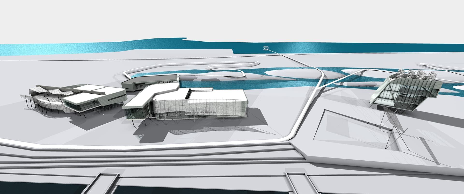 The master plan orients the project to frame views of Lake Michigan, the urban skyline, and adjacent wetlands. Buildings are positioned along a curved spine that echoes the shoreline and visitor approach paths, establishing a rhythmic sequence of entry, encounter, and rest. Pedestrian circulation is intentionally varied—shifting between direct axial promenades and softer, meandering routes through habitat zones, echoing the duality of “urban edge” and “natural interior.”