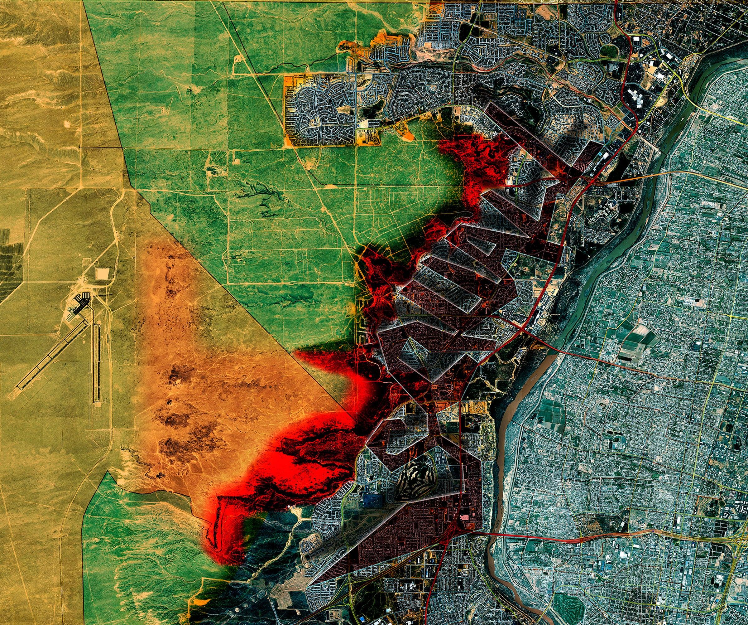 The work highlights a clash of temporalities and values: the permanence of petroglyphs etched into stone versus the transience of asphalt, drywall, and speculative development. Just as a sudden squall brings turbulence and change, suburban growth operates as a stormfront sweeping across the desert, consuming open space and eroding cultural memory. By inscribing a message at territorial scale, Squall calls attention to this encroachment while also questioning how technology mediates our understanding of land, boundaries, and heritage.