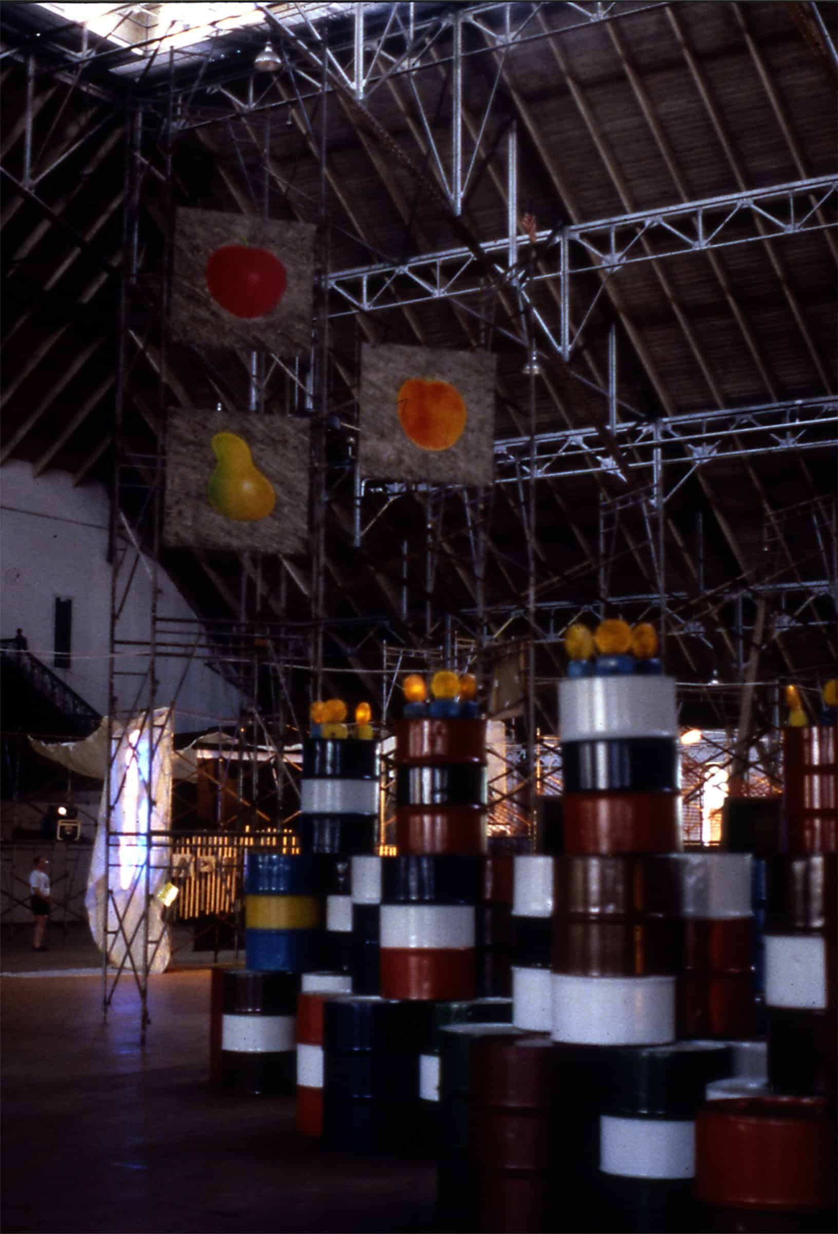 The material palette was entirely drawn from donated, salvaged, and scavenged elements, industrial scaffolding, used barrels, construction fencing, traffic mitigation equipment, and projection materials. These components were recontextualized to form display surfaces, lighting supports, and circulation enclosures. The use of modular and mobile components allowed for rapid deployment and post-exhibition removal, highlighting the temporary nature of the intervention while respecting the armory’s fragile condition.